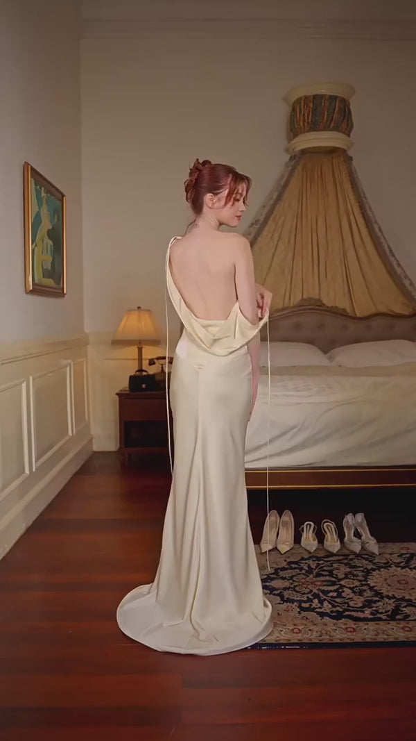 The Marcelline dress defines minimalist sophistication with its fluid silhouette and luminous satin finish. Designed to enhance your natural shape, the draped cowl neckline features on both the front and back for a timeless, delicate profile. The adjustable tie-back detail offers both a romantic touch and practical support, ensuring the bodice stays securely in place. This piece is cut true to size, designed to skim the figure comfortably without clinging.