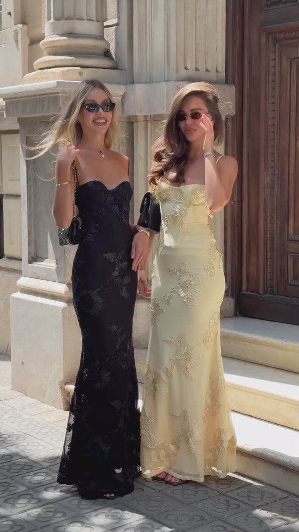 The Floral Appliqué Corset Maxi Dress – Nerida is the essence of understated luxury, designed to create a beautifully structured silhouette for your most important events. Delicate floral ribbon appliqué adorns a soft, stretch mesh base, adding texture and refinement. For elegant support, the dress features underwired cups and an internal corset; the boning offers a held-not-squeezed feel, ensuring you remain comfortable and confident. The open lace-up back allows for a customisable fit, while the skirt flares gently from the hip to allow for graceful movement.